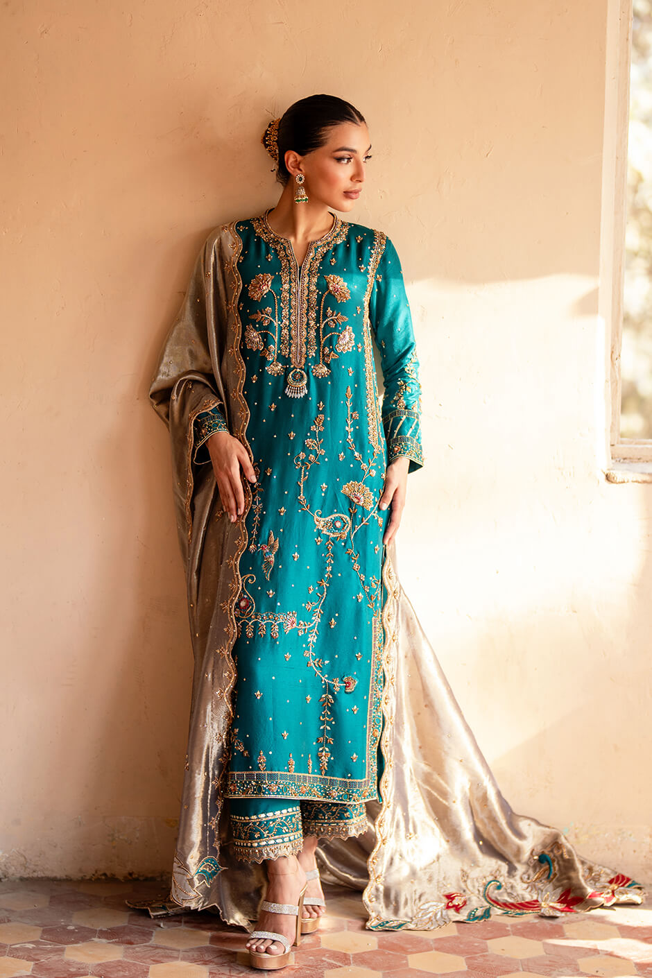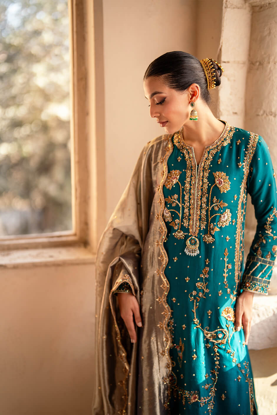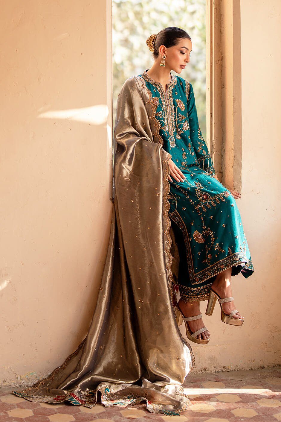 Sophisticated pure raw silk 80 gram shirt and culottes ensemble, elevated by a pure lama tissue dupatta with appliqué work. Adorned with resplendent Maroori and Cora Dabka artistry, this ensemble embodies opulent charm and nuanced sophistication.
