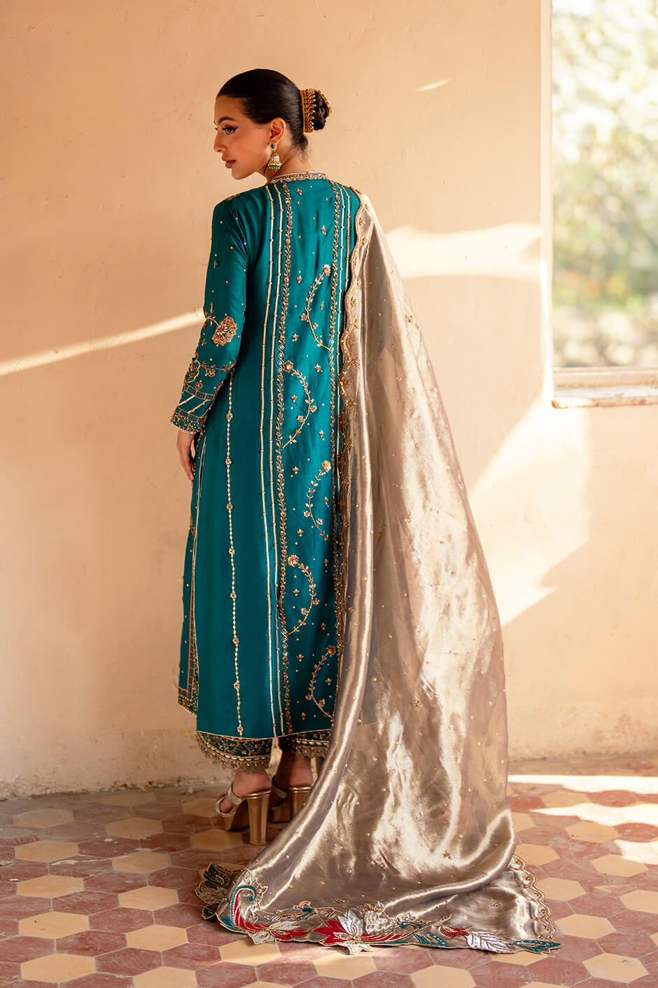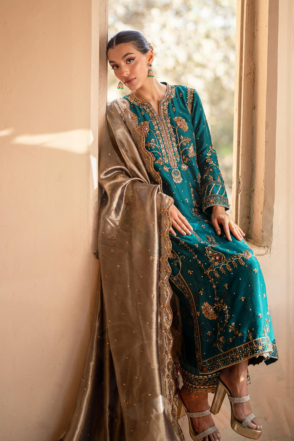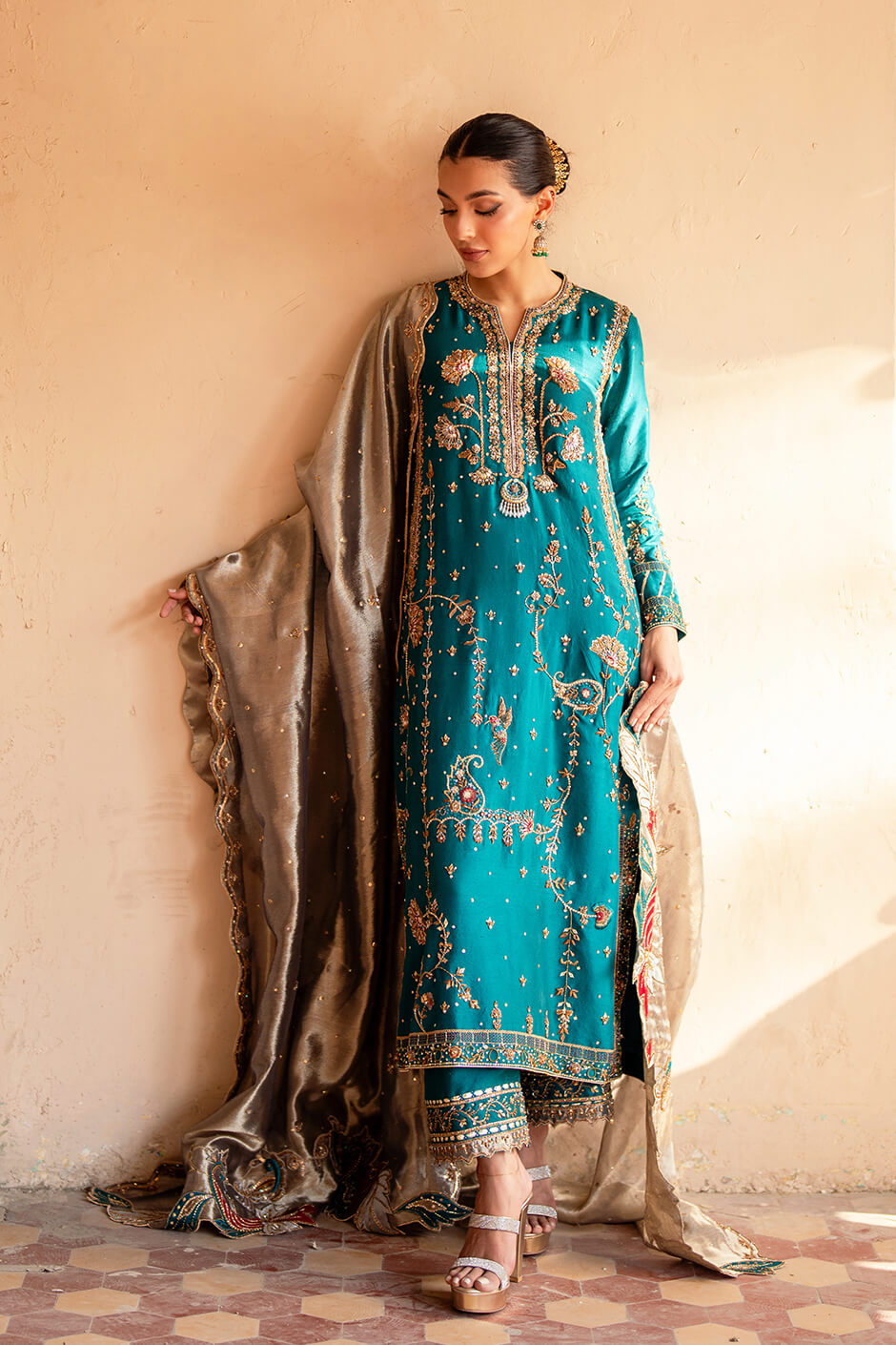 Sophisticated pure raw silk 80 gram shirt and culottes ensemble, elevated by a pure lama tissue dupatta with appliqué work. Adorned with resplendent Maroori and Cora Dabka artistry, this ensemble embodies opulent charm and nuanced sophistication.