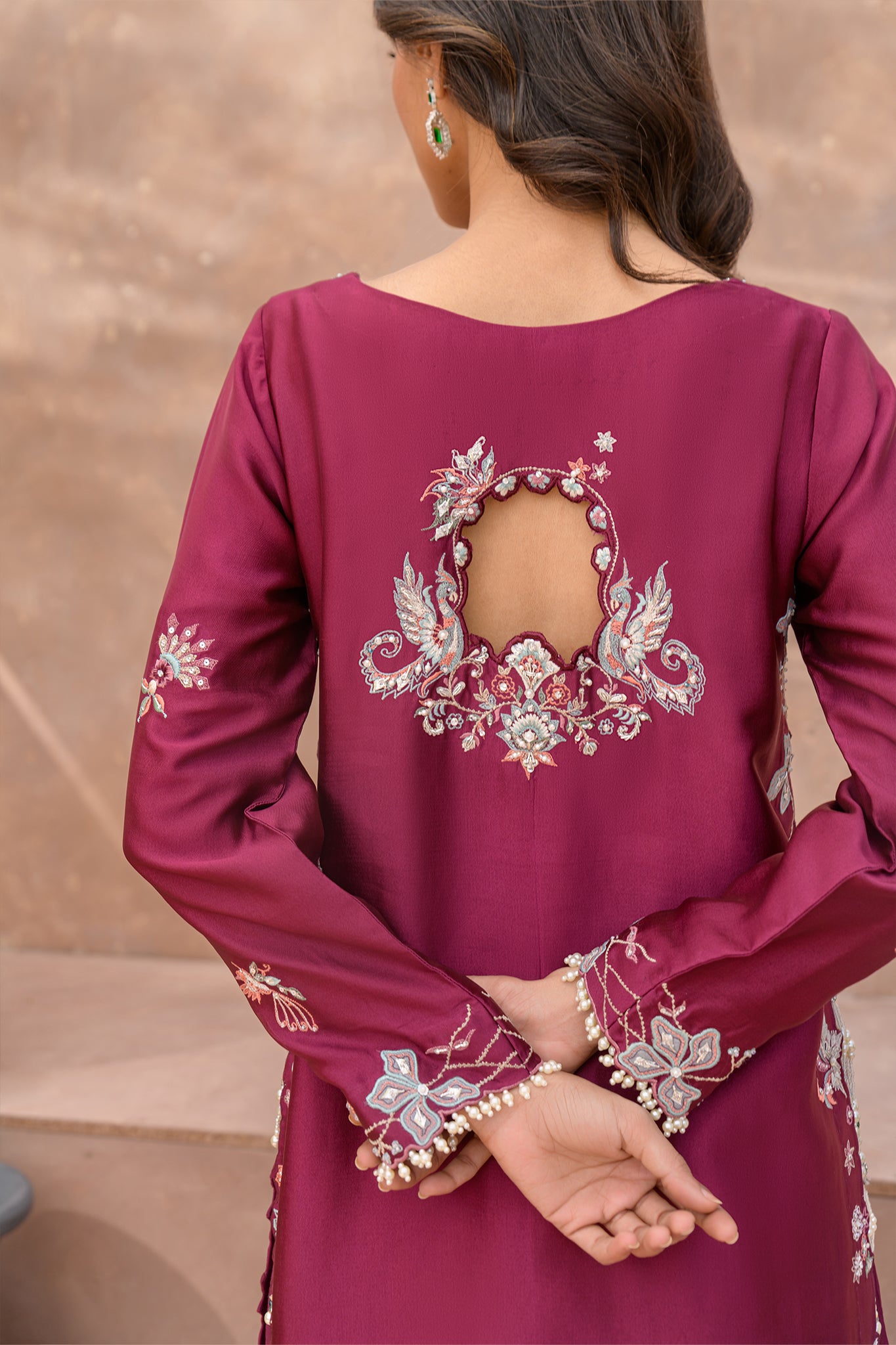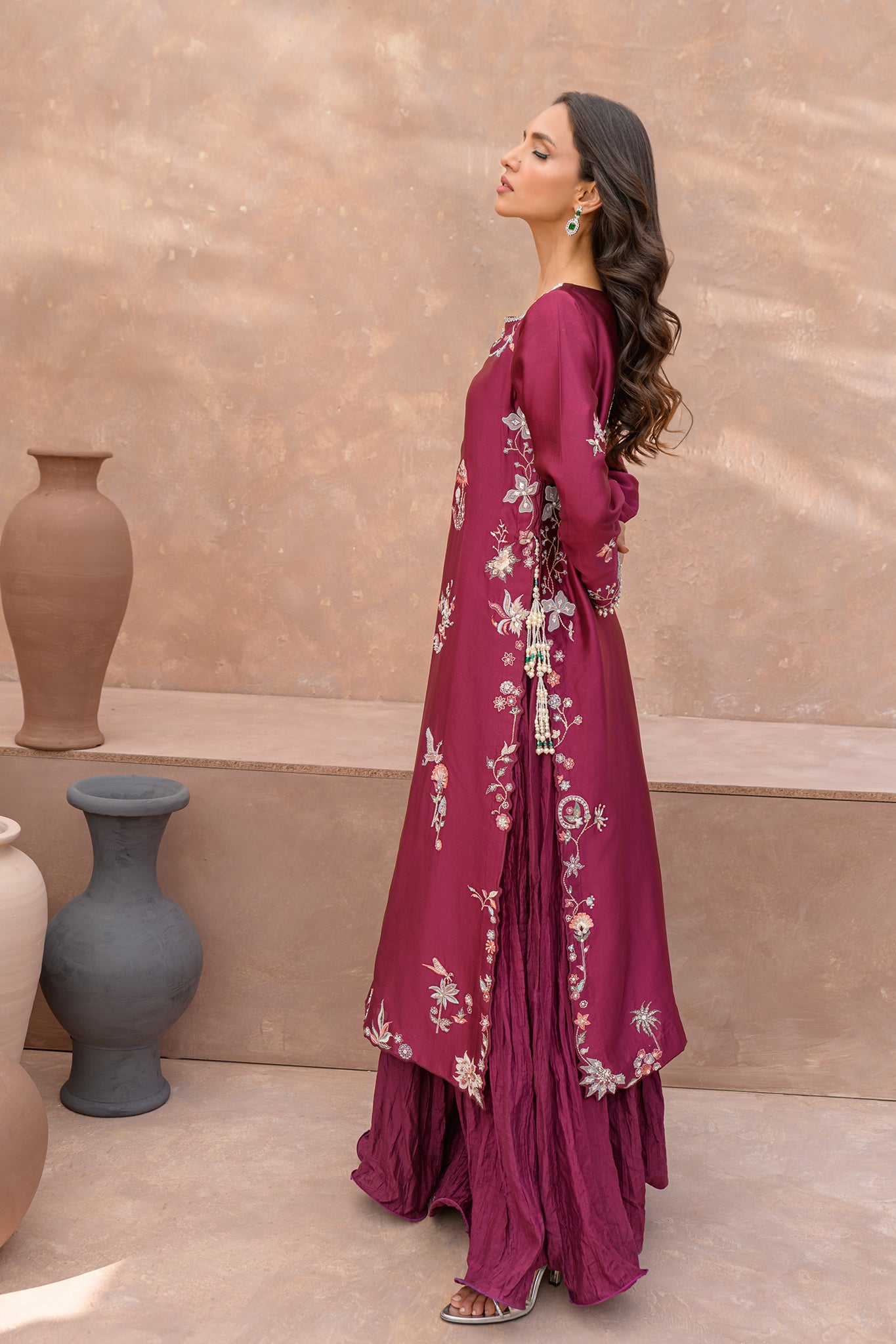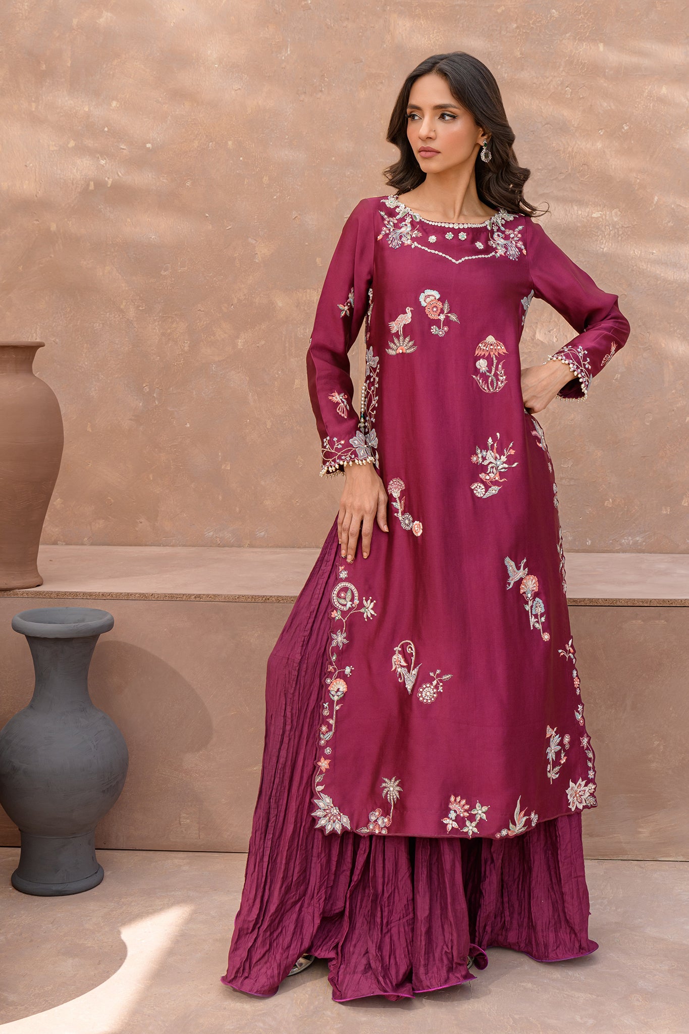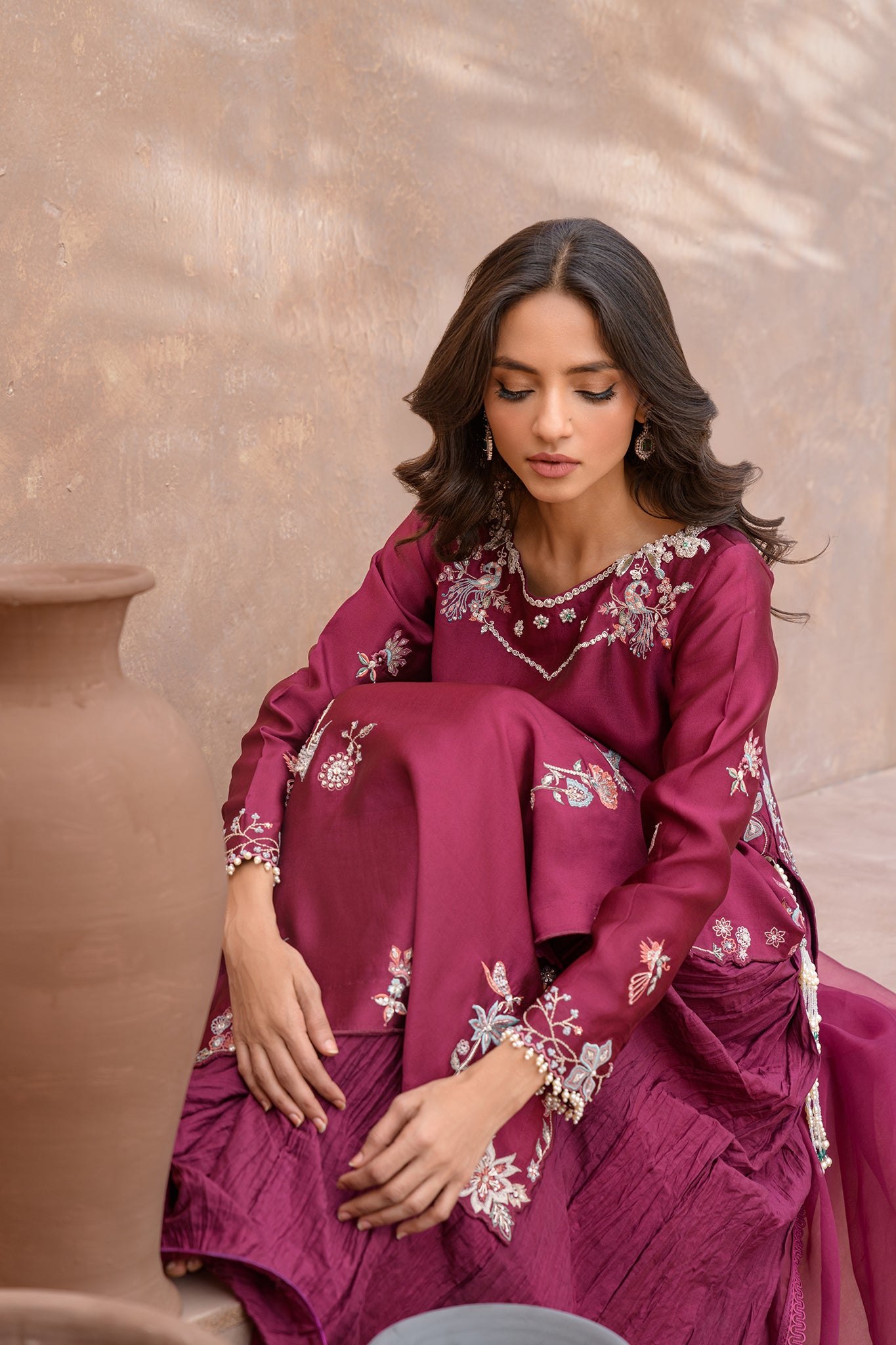 DETAILS: Elevate your style with our exquisite pure tissue silk shirt, paired with crush pure cotton silk in a rich, regal plum hue. This stunning ensemble is adorned with intricate machine embroidery, subtly enhanced with delicate handwork details, exuding elegance and sophistication. Paired with PURE cotton silk crush pants.