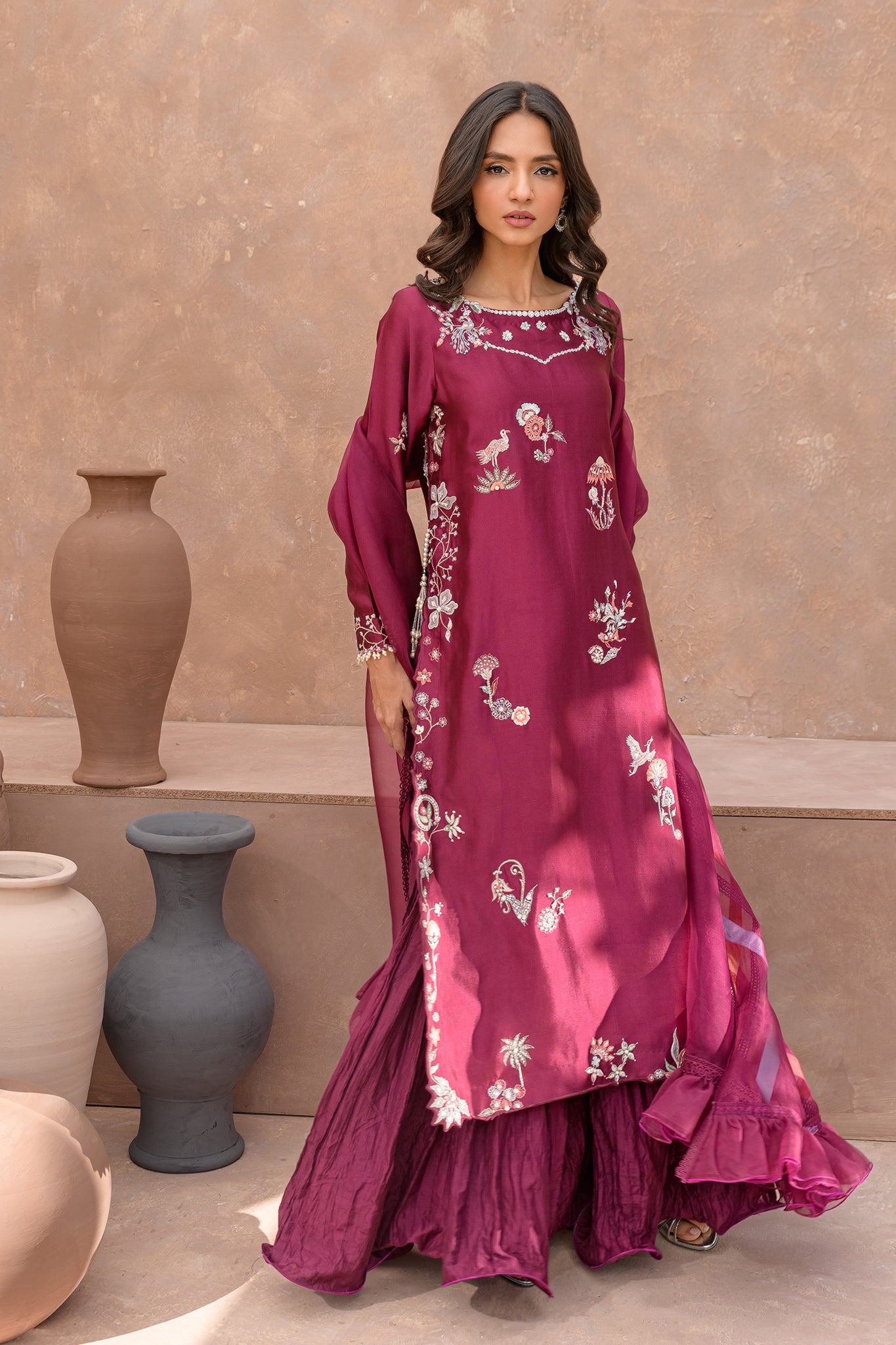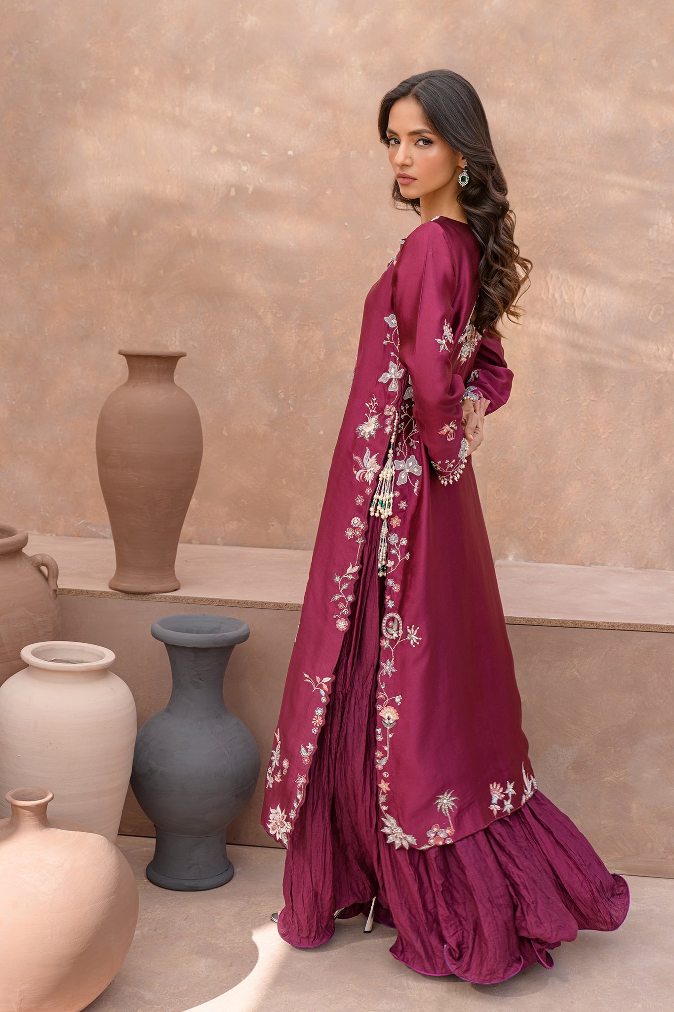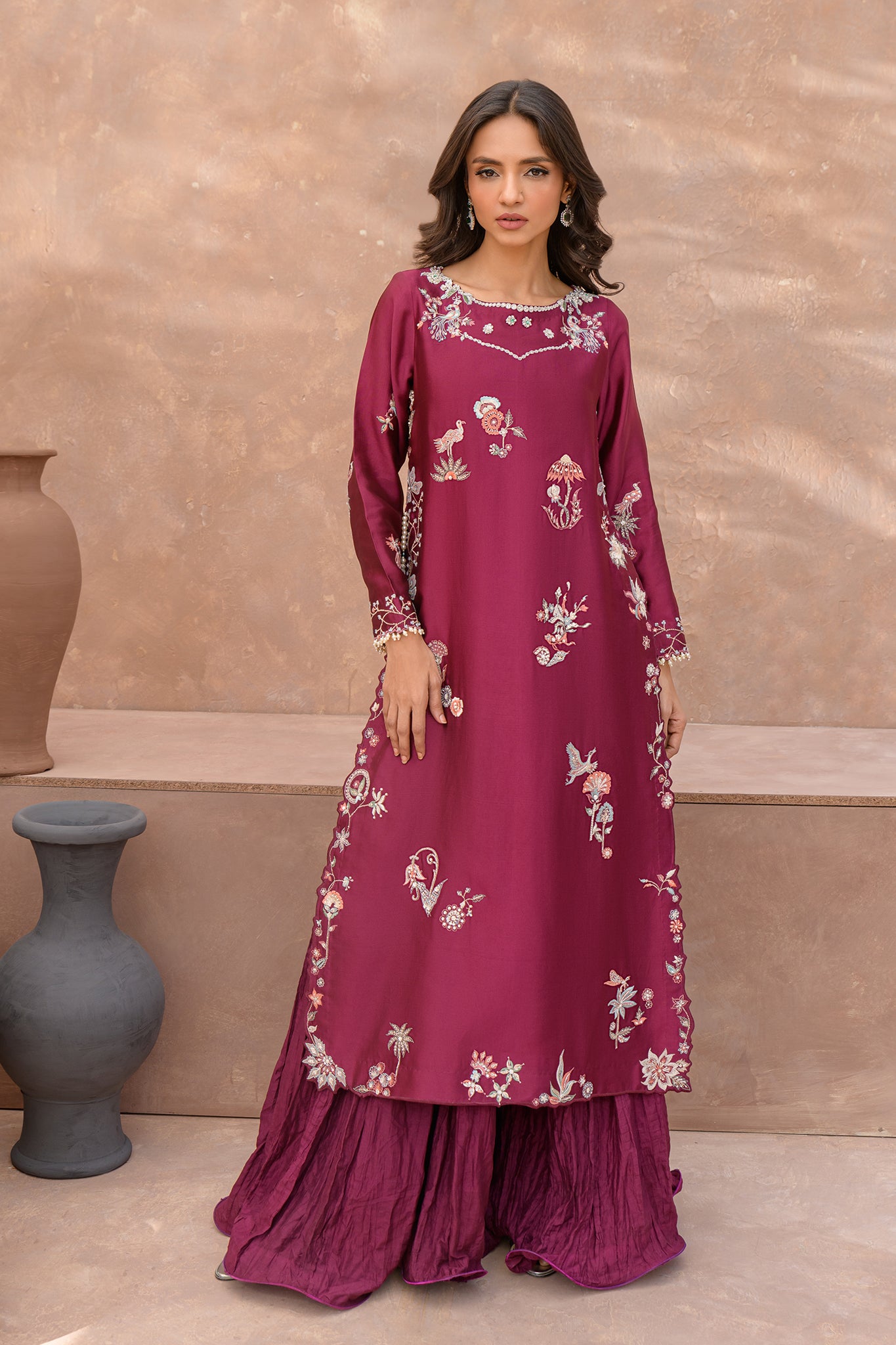 DETAILS: Elevate your style with our exquisite pure tissue silk shirt, paired with crush pure cotton silk in a rich, regal plum hue. This stunning ensemble is adorned with intricate machine embroidery, subtly enhanced with delicate handwork details, exuding elegance and sophistication. Paired with PURE cotton silk crush pants.