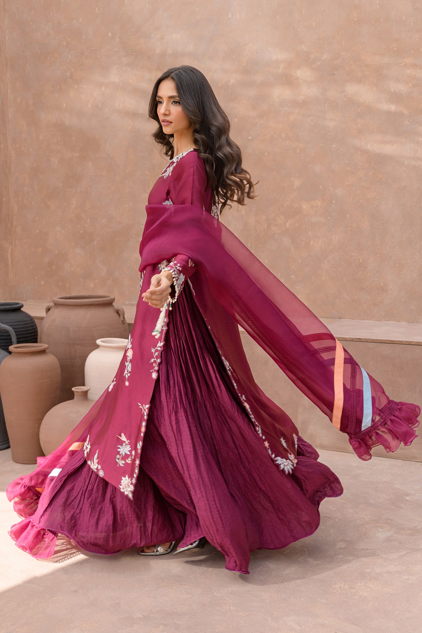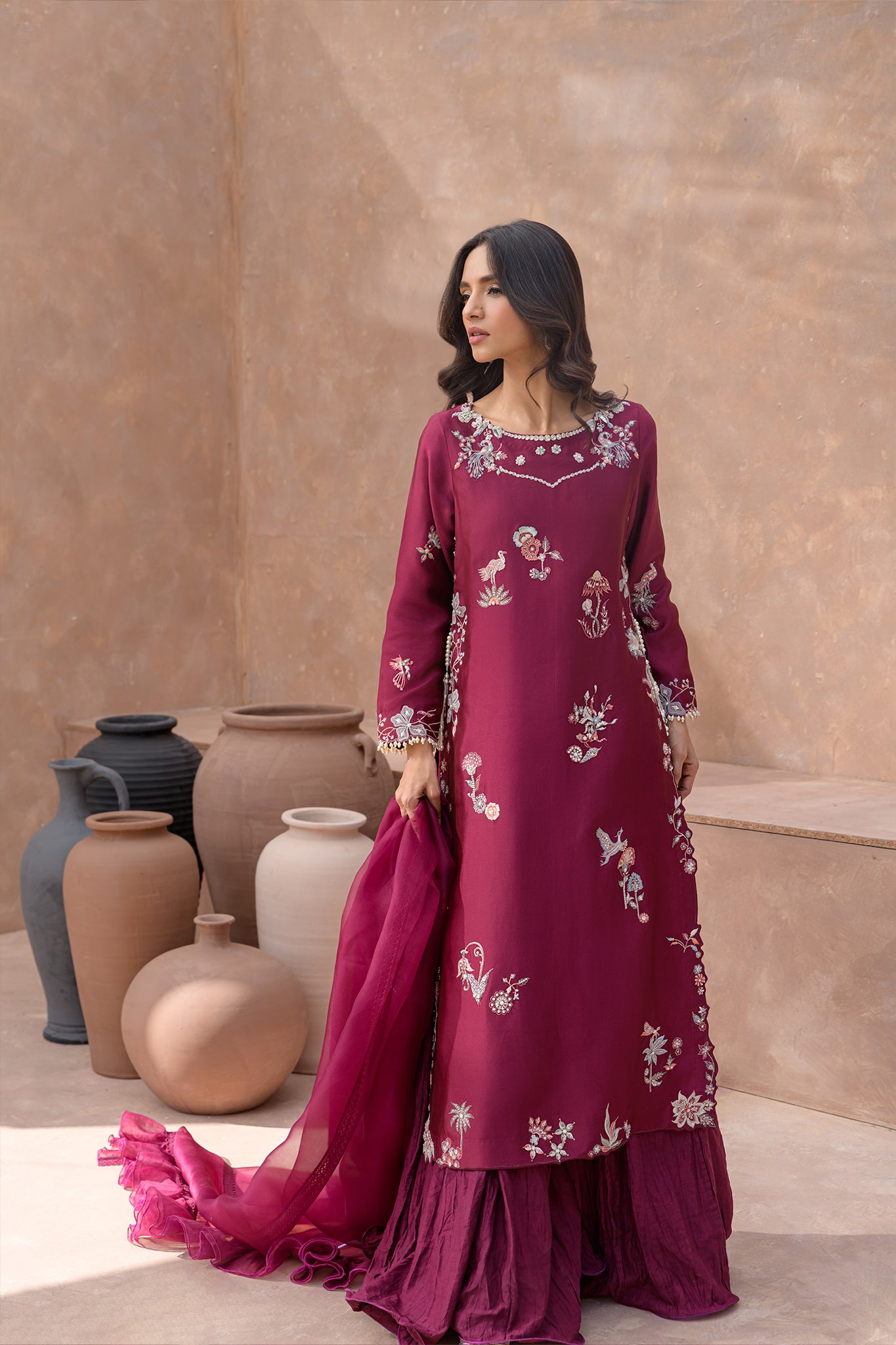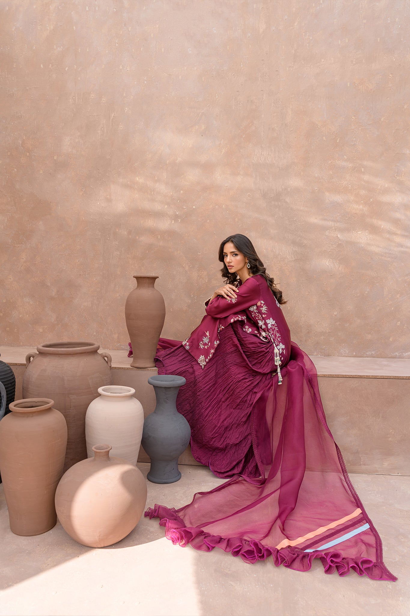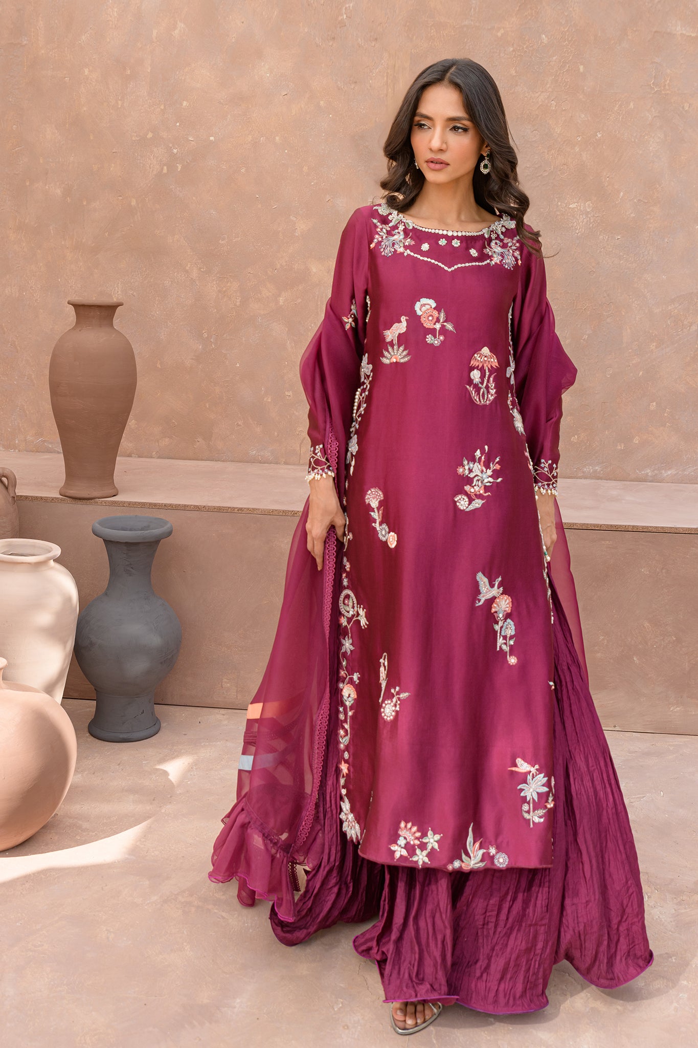 DETAILS: Elevate your style with our exquisite pure tissue silk shirt, paired with crush pure cotton silk in a rich, regal plum hue. This stunning ensemble is adorned with intricate machine embroidery, subtly enhanced with delicate handwork details, exuding elegance and sophistication. Paired with PURE cotton silk crush pants.