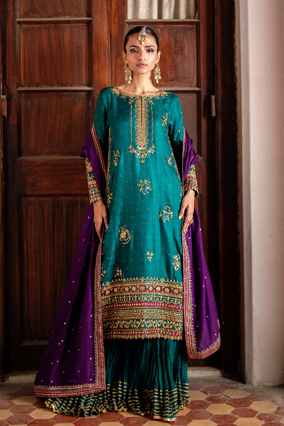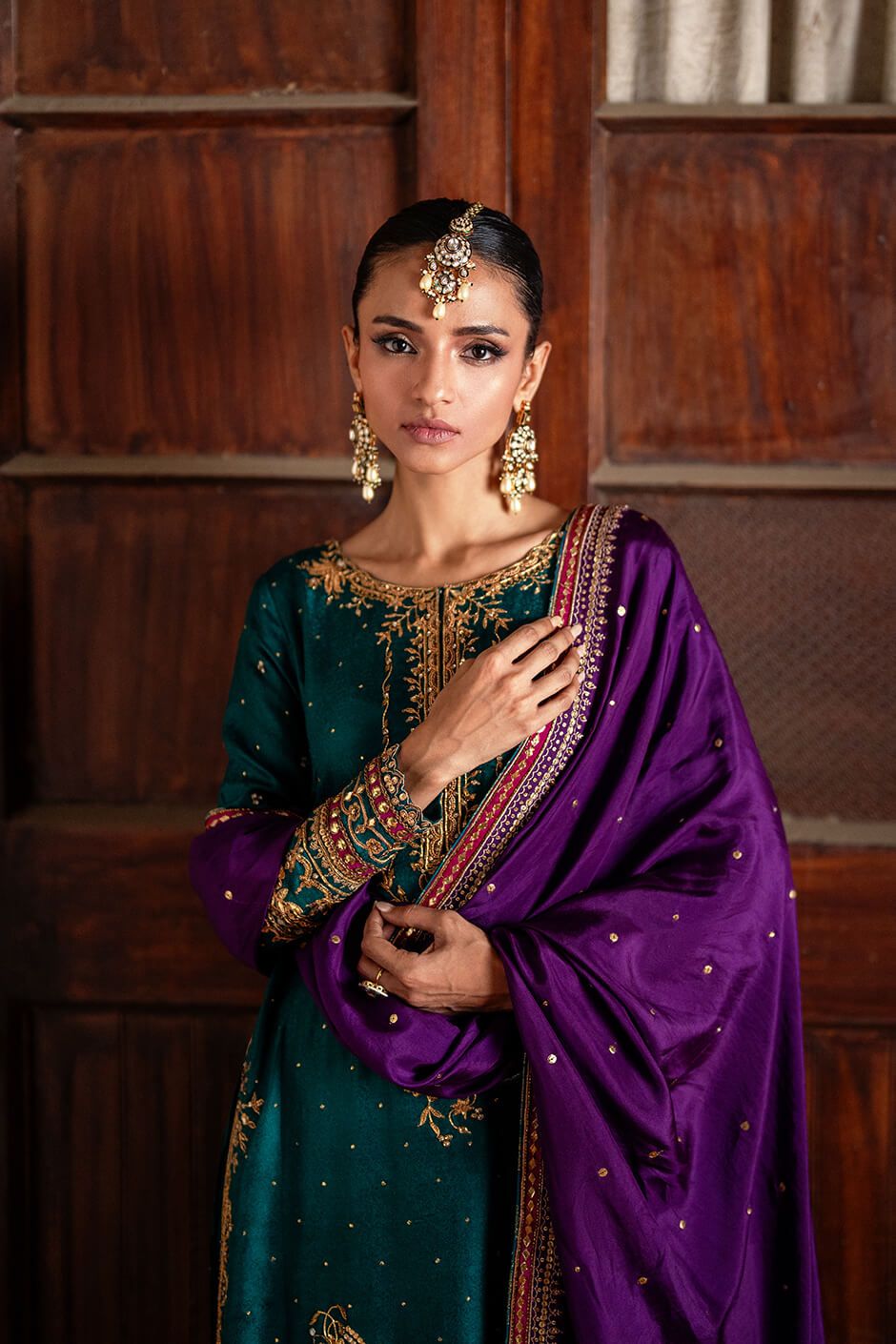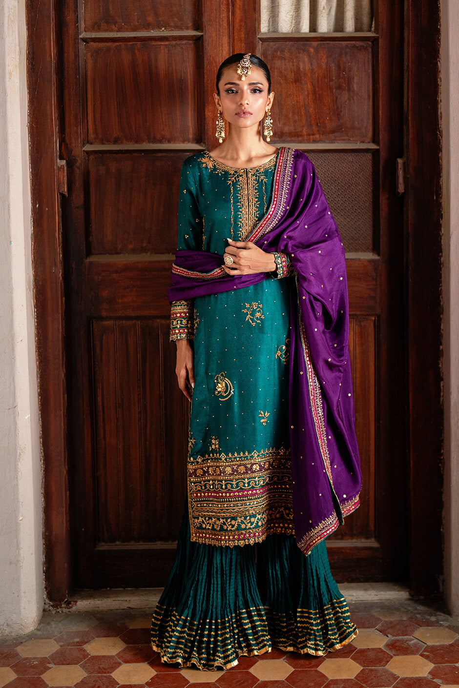 A luxurious pure Jamewar shirt is paired with elegant pure cotton silk crush pants, complemented by a delicate pure medium net dupatta. Adorned with exquisite pure Maroori work, this ensemble embodies refined sophistication and majestic charm