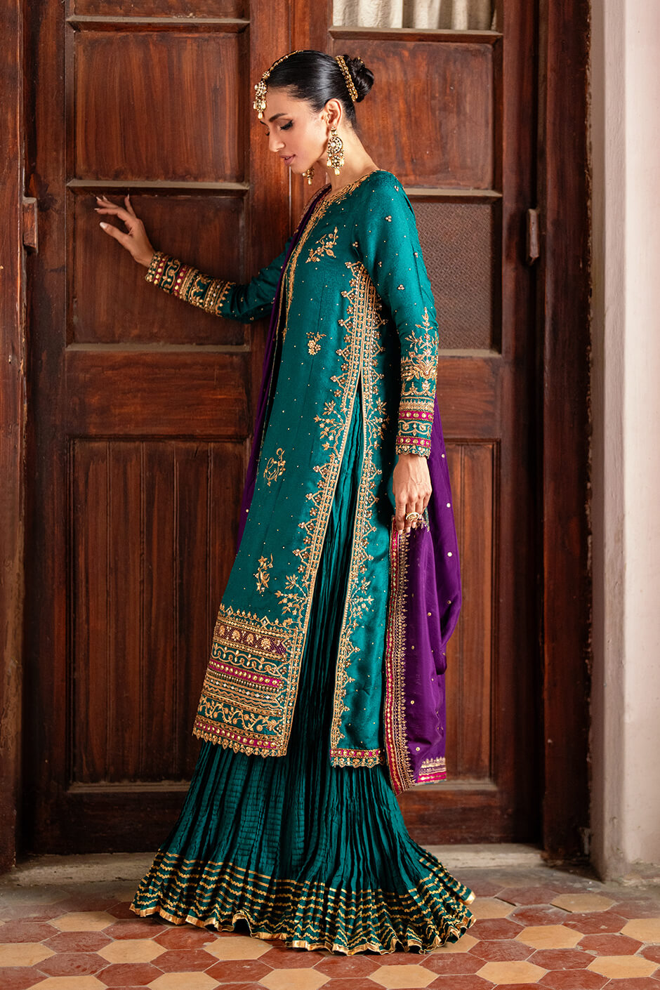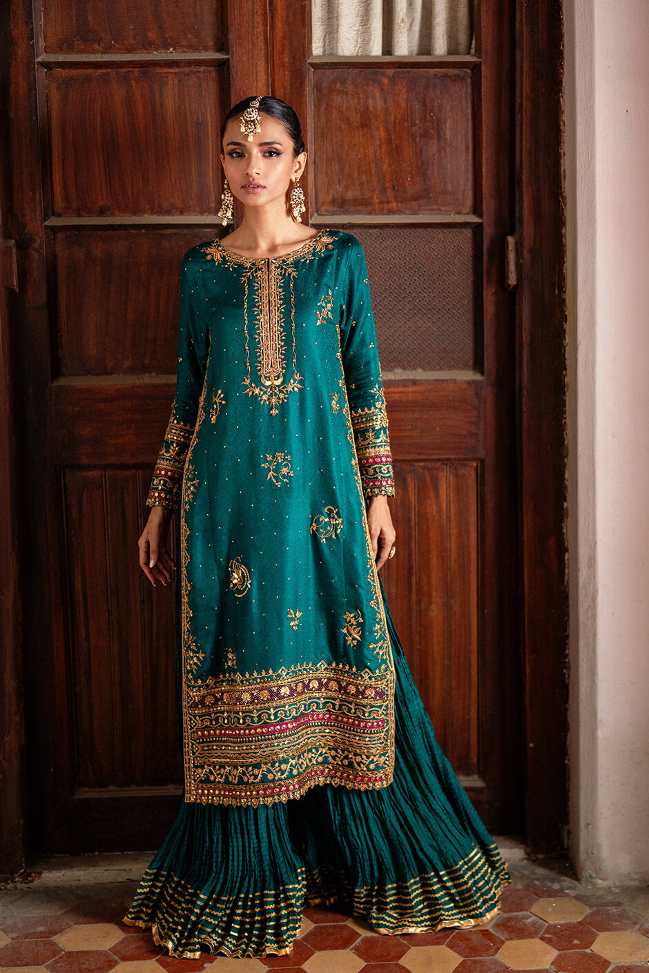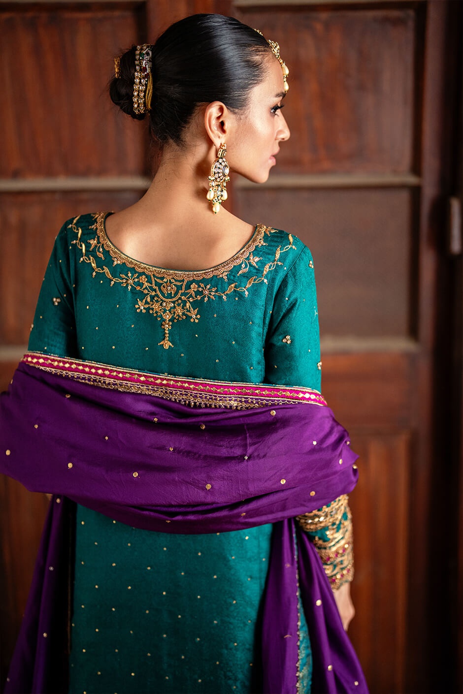 A luxurious pure Jamewar shirt is paired with elegant pure cotton silk crush pants, complemented by a delicate pure medium net dupatta. Adorned with exquisite pure Maroori work, this ensemble embodies refined sophistication and majestic charm